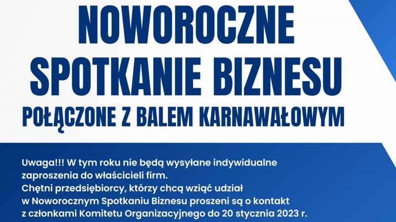 Uwaga!!! W tym roku nie będą wysyłane indywidualne zaproszenia do właścicieli firm. Chętni przedsiębiorcy, którzy chcą wziąć udział w Noworocznym Spotkaniu Biznesu proszeni są o kontakt z członkami Komitetu Organizacyjnego do 20 stycznia 2023 r. pod numerami telefonów: 668 437 427 (Teresa Grzych), 662 262 429 (Bożena Kagan), 602 242 762 (Krzysztof Kopacz), 601 704 772 (Andrzej Krzystyniak), 698 298 002 (Marek Wolak), 603 915 206 (Agnieszka Dubiel) i 606 726 844 (Beata Wilk). Odpłatność: 160 złotych od osoby.