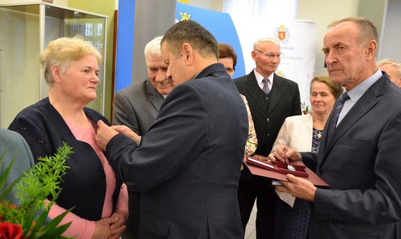 Po przemówieniach przyszedł czas na uhonorowanie jubilatów. Zastępca burmistrza w asyście przewodniczącego rady i skarbnika wręczył dostojnym parom medale za długoletnie pożycie przyznane przez Prezydenta RP.