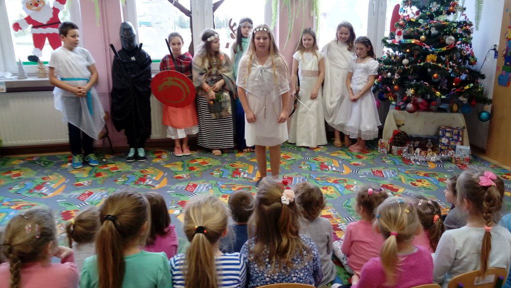 Przygotowali pomysłowe, antyczne stroje i odpowiednie atrybuty. Pracowali też wytrwale nad autoprezentacją, czyli zwięzłą informacją o danym bogu. W ten oto sposób szkolnymi korytarzami kroczyli; Zeus, Hades, Atena, Afrodyta, Demeter, Kora, Amfitryta i Hebe. Ten barwny, starożytny korowód odwiedził dzieci w przedszkolu. Wizyta niecodziennych gości wzbudziła sensację i zaciekawienie. Bogowie i boginie pięknie się zaprezentowali i (jak to bogowie) szczodrze obdarowali słodkościami przemiłych przedszkolaków.