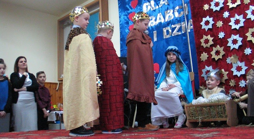 Spotkanie rozpoczęto mszą świętą w intencji seniorów. Następnie w wypełnionej po brzegi auli remizy Ochotniczej Straży Pożarnej pani dyrektor zaprosiła do obejrzenia jasełek. Zaprezentowali je uczniowie z młodszych klas, za co otrzymali duże brawa. Nie zabrakło także zabawnych scenek z życia babć i dziadków. Na zakończenie występu dzieci wręczyły seniorom specjalnie przygotowane upominki.