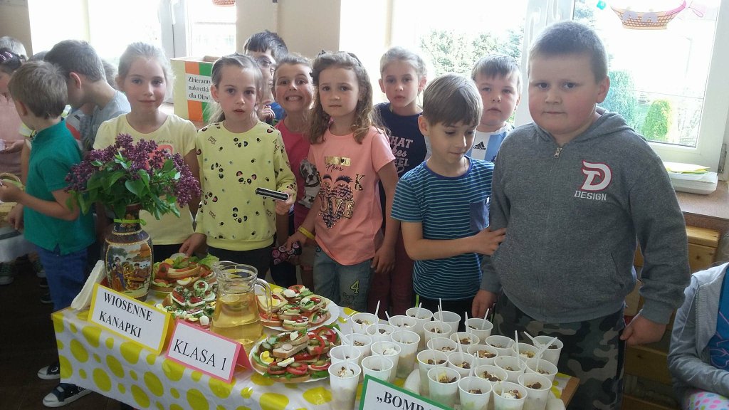 Na korytarzu zaprezentowano plakaty promujące spożywanie zdrowej żywności, a poszczególne klasy – stoiska z taką żywnością, by teoria połączyła się z praktyką. Degustacja różnego rodzaju zdrowych smakołyków cieszyła się ogromnym powodzeniem, gdyż wręcz znikały w ustach andruciki, kolorowe kanapeczki-łódeczki, sałatki owocowe, a także czerwono-białe galaretki z bitą śmietaną oraz napoje przygotowane na bieżąco ze świeżych owoców. Wszyscy zachwycali się i bez mrugnięcia okiem wydawali kolejne 0,20 zł na kupno kiermaszowego rarytasu.