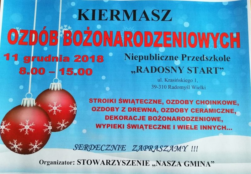 Będzie miał on miejsce przy Niepublicznym Przedszkolu Radosny Start (ul. Krasińskiego 1). Początek wydarzenia zaplanowano na godz. 8.00. Potrwa ono do godz.15.00. W tym czasie będzie można nabyć stroiki świąteczne, ozdoby choinkowe, świece, ozdoby ceramiczne i drewniane oraz ciasta. Ozdoby, które znajdą się na kiermaszu organizowanym przez Stowarzyszenie „Nasza Gmina”, wykonane zostały przez osoby niepełnosprawne.