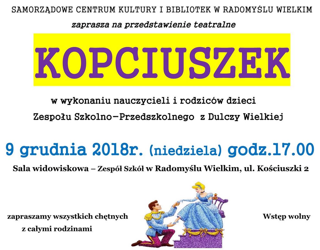 W role bohaterów tej popularnej baśni dla dzieci wcielą się nauczyciele i rodzice uczniów Zespołu Szkolno-Przedszkolnego z Dulczy Wielkiej. Po dwóch udanych występach w swojej miejscowości tym razem zagoszczą oni na deskach sali widowiskowej radomyskiego Zespołu Szkół (ul. Kościuszki 2). Początek przedstawienia o godz.17.00. Wstęp wolny. Zapraszamy serdecznie całe rodziny.