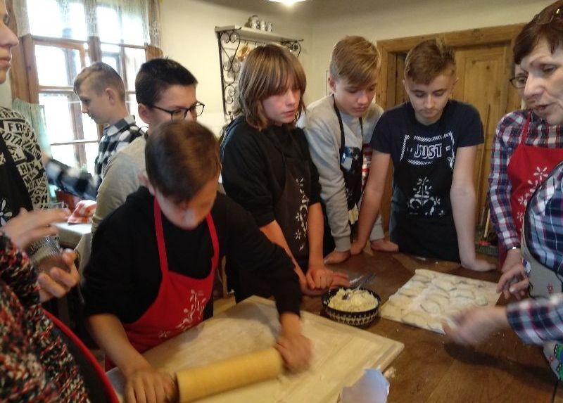 Na początku zwiedzili starą olejarnię oraz chałupy, gdzie przewodnik opowiedział ze szczegółami o świątecznym wystroju izb i wróżbach wigilijnych. Uczniowie dowiedzieli się, czym są jutki oraz pająki, dlaczego w kącie izby stawiano snop zboża, a na podłodze rozścielano słomę, na której spano w nocy oraz po co pod świąteczny stół kładziono siekierę. Później wrócili do budynku starej szkoły, w której obejrzeli film przedstawiający obyczaje wigilijne w dawnych czasach. Kolejną atrakcją było wykonanie tradycyjnych ozdób choinkowych z bibuły i słomy, którymi przystroją choinkę w swojej klasie. Największą przyjemność sprawiło im lepienie pierogów. Zarówno dziewczyny, jak i chłopcy udowodnili, że lepienie pierogów nie jest trudną pracą. Kiedy wszystkie potrawy były gotowe młodzi radomyślanie zasiedli do wspólnej wieczerzy. Na stole pojawiły się: barszcz z grzybami i ziemniakami, groch z kapustą, pierogi ruskie, kompot z suszu i oczywiście opłatek. Wigilia rozpoczęła się od składania życzeń, a zakończyła się wspólnym śpiewaniem kolęd i pastorałek oraz wręczeniem prezentów. Wszystkim uczniom bardzo podobał się razem spędzony dzień wigilii klasowej. Wpłynął on na integrację zespołu klasowego i na długo pozostanie w pamięci.
