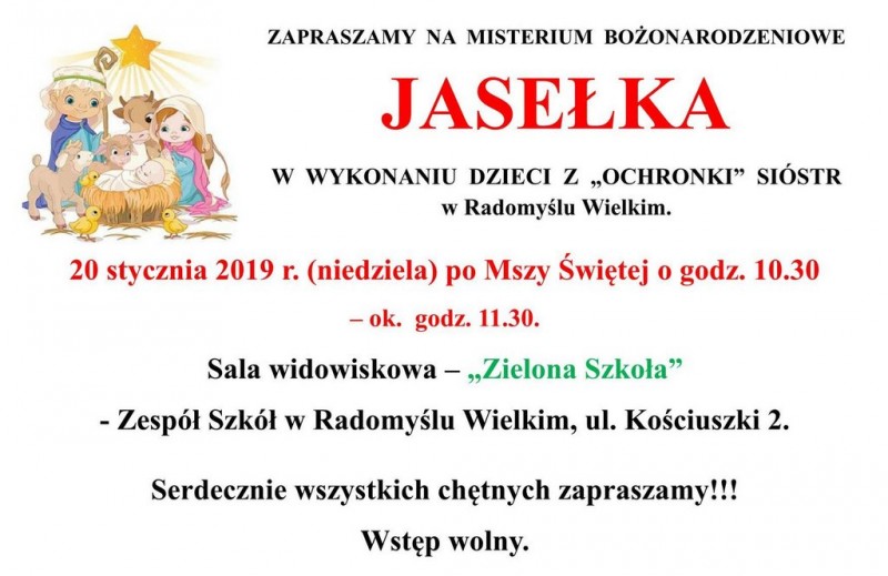 Jasełka odbędą się 20 stycznia (niedziela) ok. godz. 11.30 (po Mszy Świętej - sumie, o godz. 10.30) w sali widowiskowej Zespołu Szkół w Radomyślu Wielkim, przy ul. Kościuszki 2. (tzw. zielona szkoła). Wszystkich chętnych serdecznie zapraszamy. Wstęp wolny.