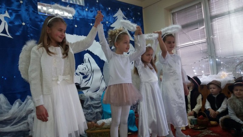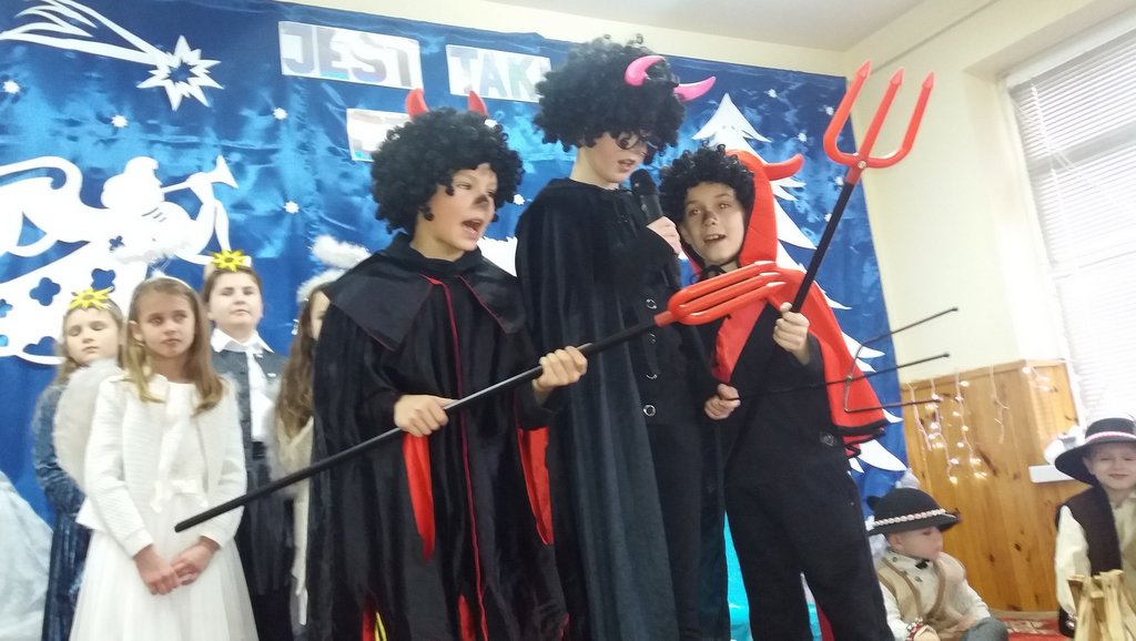 Uczniowie przedszkola i klasy II-III pod kierunkiem swoich wychowawczyń zaprezentowali jasełka, w których przewijał się motyw zwycięstwa dobra nad złem, a więc nieustraszonych aniołów nad dość groźnymi, ale sympatycznymi diabełkami, by w końcu zapanowała radość z przyjścia na świat Jezusa i przybycia Trzech Króli. Pełne humoru życzenia złożyli również pierwszoklasiści.