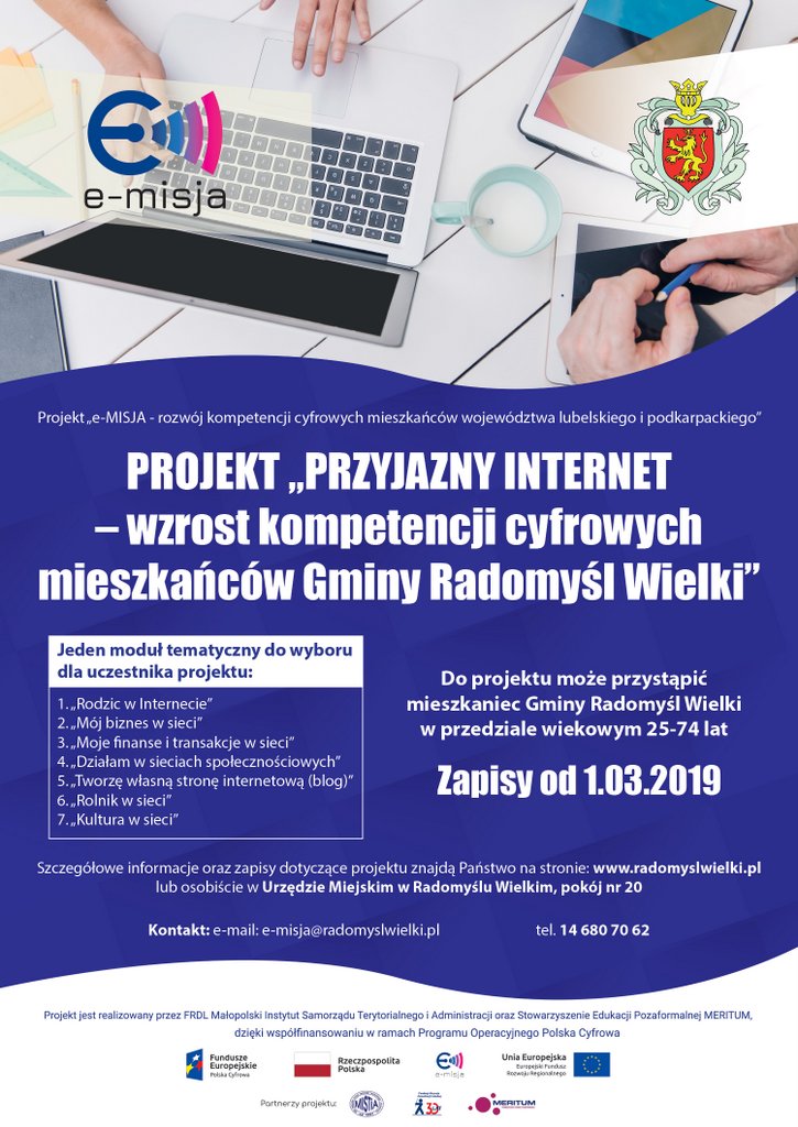 Więcej informacji uzyskać można u Koordynatora Projektu: Andrzej Przybyszewski, 14 68 07 062 w godzinach pracy Urzędu Miejskiego w Radomyślu Wielkim lub pod adresem email: e- misja@radomyswielki.pl.