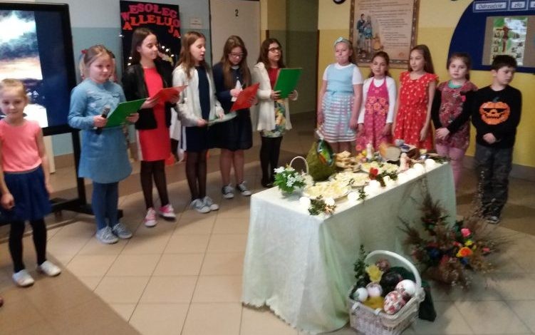 Występujący na scenie uczniowie, przygotowani przez panią Barbarę Moskalczyk, przedstawili refleksyjny montaż słowno-muzyczny, wprowadzając wszystkich zgromadzonych w okres Wielkiego Tygodnia, Triduum Paschalne i Świąt Wielkanocnych. Na zakończenie Samorząd Szkolny złożył życzenia wielkanocne dla wszystkich uczniów i nauczycieli. Wspólne rozważanie tajemnicy Wielkiej Nocy oraz końcowe serdeczne życzenia złożone przez dyrektora Piotra Masłyka i księdza Eugeniusza Haburę pozwoliły całej społeczności szkolnej poczuć niezwykłą atmosferę Świąt Zmartwychwstania Pańskiego.