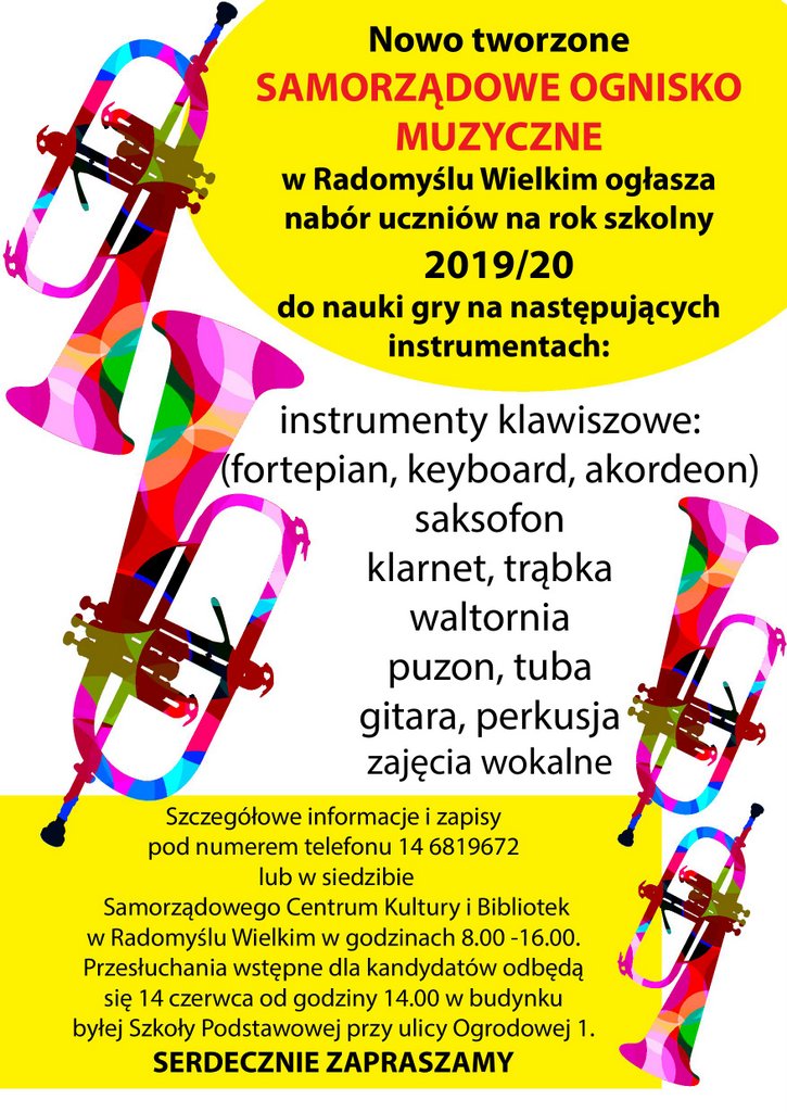 Zachęcamy dzieci, młodzież, a także dorosłych (nie tylko z naszej gminy) do zapisów do powstającego Samorządowego Ogniska Muzycznego w Radomyślu Wielkim.