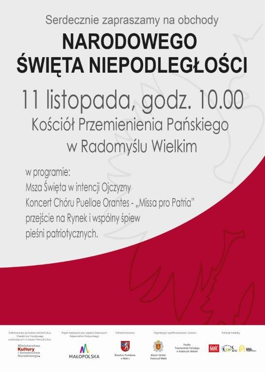 Z kolei na 11 listopada na obchody 101. rocznicy odzyskania niepodległości zapraszają Burmistrz Radomyśla Wielkiego, SCKiB i Parafia Przemienienia Pańskiego w Radomyślu Wielkim. Rozpoczną się one o godz. 10.00 w Kościele Parafialnym pw. Przemienienia Pańskiego w Radomyślu Wielkim Mszą Świętą w intencji Ojczyzny. Po niej odbędzie się koncert „Missa pro Patria” w wykonaniu Dziewczęcego Chóru Katedralnego „Puellae Orantes” z Tarnowa. Następnie zgromadzeni przejdą na rynek, gdzie o godz. 12.00. w ramach ogólnopolskiej akcji „Niepodległa do hymnu” odśpiewany zostanie „Mazurek Dąbrowskiego”. Obchody dopełni wspólny śpiew pieśni patriotycznych. - Do wzięcia udziału w tej ogólnopolskiej akcji zapraszamy wszelkie instytucje i organizacje, a także wszystkich mieszkańców gminy, którzy chcą wspólnie z bliskimi, przyjaciółmi, sąsiadami zaśpiewać Mazurka Dąbrowskiego, a później inne pieśni patriotyczne – przekazują organizatorzy.