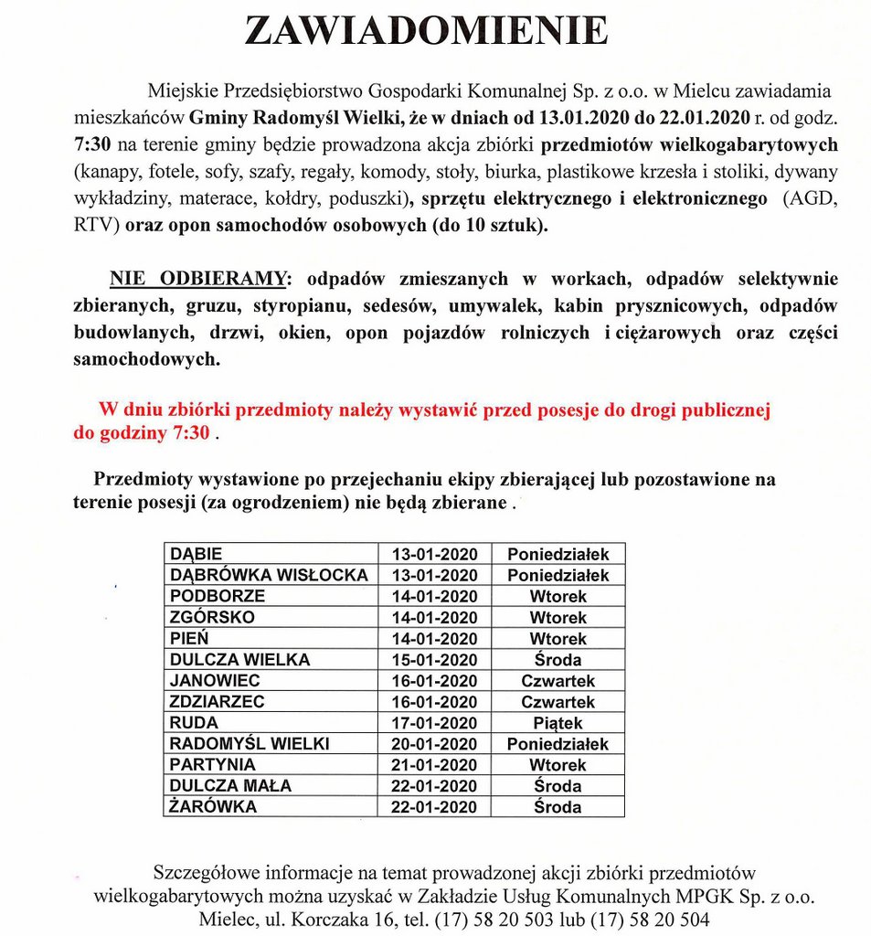 Miejskie Przedsiębiorstwo Gospodarki Komunalnej Sp. z o.o. w Mielcu w dniach od 13 do 22 stycznia 2020 r. przeprowadzi na terenie naszej gminy zbiórkę przedmiotów wielkogabarytowych (np. kanapy, fotele, stoliki, wykładziny, itp.), sprzętu AGD i RTV oraz opon samochodów osobowych.