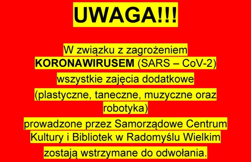 Wszystkie zajęcia dodatkowe dla dzieci i młodzieży (robotyka, plastyczne, taneczne i muzyczne w ramach Samorządowego Ogniska Muzycznego) prowadzone przez Samorządowe Centrum Kultury i Bibliotek w Radomyślu Wielkim zostają wstrzymane do odwołania. Również Biblioteka Publiczna w Radomyślu W. wraz z wszystkimi filiami (Dulcza Wielka, Ruda, Zdziarzec i Żarówka) została zamknięta do odwołania.