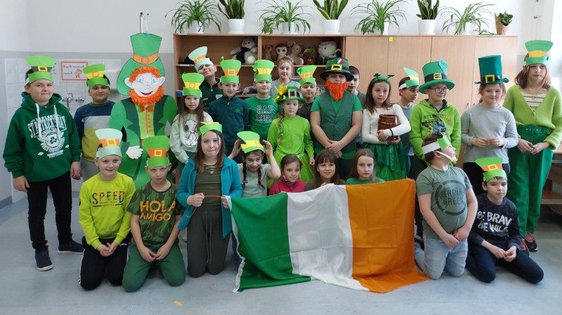 W tym dniu zazieleniło się na szkolnych korytarzach ponieważ uczniowie założyli ubrania w kolorze zielonym oraz fantastyczne nakrycia głowy. Przygotowali również lapbooki o Irlandii i św. Patryku. Na lekcjach języka angielskiego uczniowie poznali historię i tradycje Irlandii, dowiedzieli się wiele ciekawostek o życiu patrona Irlandii - Świętego Patryka oraz o znaczeniu trójlistnej koniczyny. Uczniowie klas młodszych poznali również legendę o garnku złota na końcu tęczy, którego strzeże skrzat Leprechaun. Miłą niespodzianką było znalezienie garnka „złotych” monet w naszej szkole, którymi wszyscy uczniowie zostali obdarowani na szczęście.