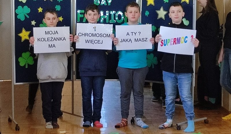 Nawiązuje do obecności u osób z zespołem Downa dodatkowego, trzeciego chromosomu w 21. parze chromosomów. Cała społeczność szkolna zjawiła się w kolorowych skarpetkach nie do pary, ponieważ stały się one symbolem Światowego Dnia Zespołu Downa z powodu kształtu chromosomu. Ich różnorodność i wielobarwność są wyrazem tolerancji i znakiem, że mimo odmienności możemy w pełni cieszyć się życiem. Cieszymy się, że znów mogliśmy ten dzień spędzić wspólnie, w szkole.