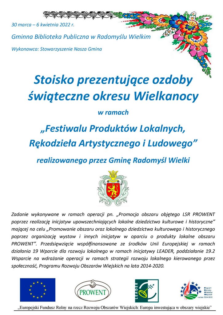 Stoisko przygotowało Stowarzyszenie „Nasza Gmina” w ramach „Festiwalu Produktów Lokalnych, Rękodzieła Artystycznego i Ludowego” realizowanego przez Gminę Radomyśl Wielki, w ramach unijnego projektu grantowego.