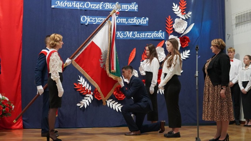 W kolejnym punkcie prowadzący poprosili Stanisławę Żmudę – prezesa Stowarzyszenia „Szkoła dla wszystkich” o odczytanie aktu ufundowania sztandaru, przekazując go na ręce pani dyrektor, która przyklękając ucałowała go i wyraziła podziękowanie za tak cenny dar, jako znak wartości będących fundamentem pracy wychowawczej szkoły, podkreślając, że od tego momentu będzie on miał dla nas wielkie i symboliczne znaczenie, będzie towarzyszył nam w podniosłych chwilach szkolnego życia. Po chwili do sztandaru zbliżyli się przedstawiciele uczniów i – również przyklękając – ucałowali jego brzeg. Pani dyrektor oddała w ich ręce sztandar, życząc, aby stał się on dla społeczności uczniowskiej symbolem hartu ducha, woli zwycięstwa, a także tego, co najlepsze i godne naśladowania. Niezwykle podniosłym momentem było złożenie przez przedstawicieli uczniów naszej szkoły ślubowania na sztandar, po czym zaprezentowano awers i rewers sztandaru. Oficjalna uroczystość zakończyła się wyprowadzeniem sztandaru.