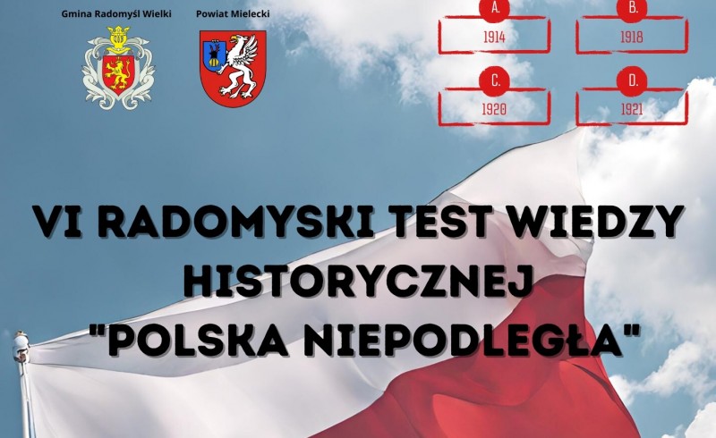 - Po raz szósty z okazji Święta Niepodległości organizujemy zmagania dotyczące naszej historii z czasów rodzącej się niepodległości Rzeczpospolitej. Odbędą się one w formule otwartej. Zapraszamy więc wszystkich miłośników historii bez względu na wiek i wykształcenie do wspólnej zabawy oraz upamiętnienia 105. rocznicy odzyskania przez Polskę niepodległości. Dla uczestników, nie tylko laureatów, przewidzieliśmy atrakcyjne nagrody – mówi organizator testu Krzysztof Babiarz z Urzędu Miejskiego w Radomyślu Wielkim.