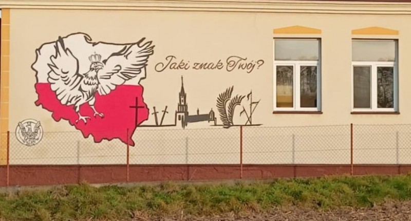 Kto ty jesteś? — Polak mały. — Jaki znak twój? — Orzeł biały. — Gdzie ty mieszkasz? — Między swemi. — W jakim kraju? — W polskiej ziemi. itd. To dzieło Władysława Bełzy – Katechizm polskiego dziecka - każdy z nas, zna ten wiersz. Jak ważnym elementem edukacji jest patriotyzm myślę, że nie trzeba mówić. Ale trzeba przypominać… i uczyć młodych ludzi prawdziwej historii, uczyć miłości do Polski do polskiej tradycji. Jaki znak Twój? – na to zapytanie odpowiedzią jest właśnie ten mural, który powstał na murach szkoły w Dąbiu. Przedstawia to co jest najważniejsze dla Polaka – symbole i barwy narodowe. Ten mural to opowieść o naszej historii naszej tożsamości, naszych dziejach, waleczności opowieść o honorze, odwadze i niezłomności. Jednocześnie jest odpowiedzią na pytanie, które od pokoleń rozbrzmiewa w sercach Polaków: Jaki znak Twój?