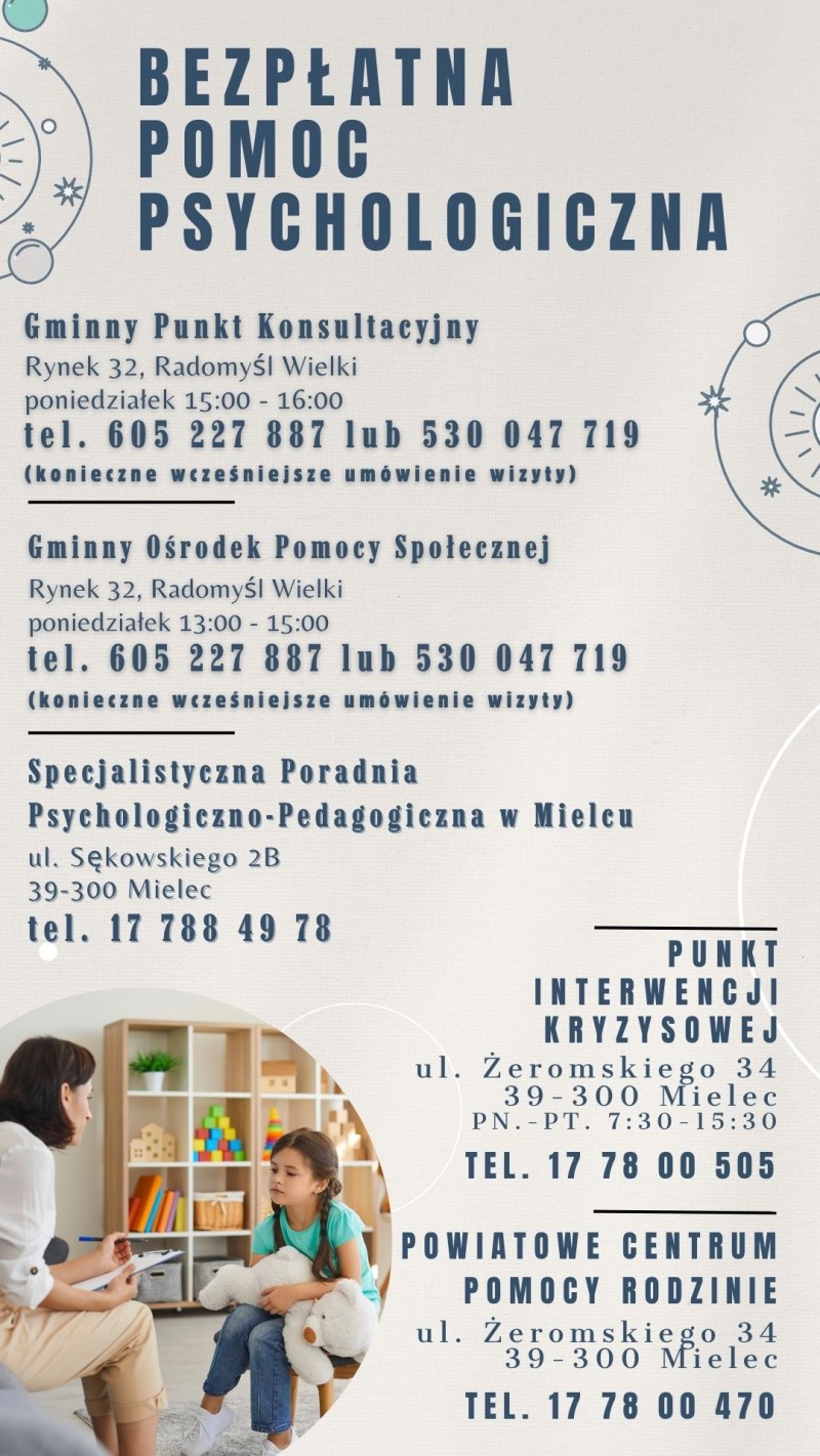 Pomoc udzielana jest bezpłatnie przez wykwalifikowanych specjalistów i obejmuje m.in. wsparcie w sytuacjach kryzysowych oraz problemach emocjonalnych.
