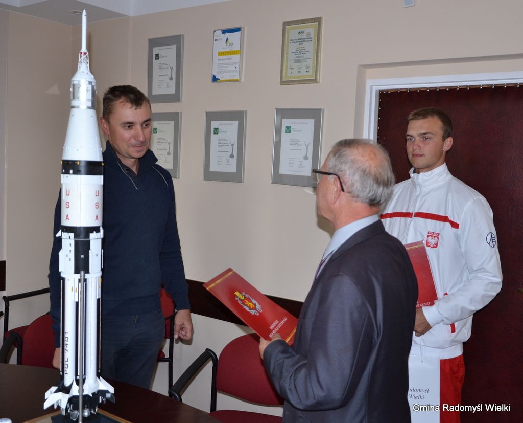Włodarz w imieniu samorządowych władz gminy i własnym pogratulował sukcesu modelarzowi z Radomyśla Wielkiego i jego instruktorowi. - Wywalczone w pięknym stylu indywidualne tytuły mistrza i II wicemistrza Europy, a także dwa medale w klasyfikacji drużynowej, to powód do dumy nie tylko dla ciebie, twojej rodziny i trenera, ale i mieszkańców naszej gminy. Swoją postawą udowodniłeś, że zaczynając karierę sportową w niewielkiej miejscowości dzięki pasji, wytrwałości i ciężkiej pracy można odnosić sukcesy również na arenie międzynarodowej. Już teraz pomimo młodego wieku możesz być wzorem dla innych sportowców z naszej gminy. Wierzę, że jeszcze wielokrotnie będziemy cieszyć się z twoich osiągnięć – powiedział burmistrz Rybiński wręczając mistrzowi Europy list gratulacyjny i okolicznościowy upominek. Gratulacje odebrał także Grzegorz Goryczka, instruktor Andrzeja.