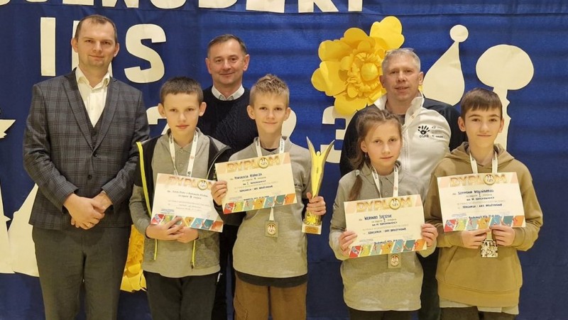 W rywalizacji z 11 drużynami na dystansie 11 rund systemem szwajcarskim, nasi uczniowie pokazali nie tylko umiejętności, ale i sportowe zaangażowanie, walcząc w trudnych partiach przy bardzo wysokim poziomie rozgrywek. W klasyfikacji punktowej radomyska podstawówka uzyskała tyle samo punktów co drużyna z SP nr 1 Brzozów, jednak zdecydowały małe punkty, w których nasza drużyna przegrała jednym punktem. Na ten sukces złożyły się wyniki Szymona Wolińskiego - 10.5 pkt. (na trzeciej szachownicy 1. miejsce), Weroniki Szęszoł - 10 pkt. (na czwartej szachownicy 1. miejsce), Mikołaja Kopacza - 9 pkt. (na pierwszej szachownicy 2. miejsce) i Adriana Szęszoła - 8 pkt. (na drugiej szachownicy 4. miejsce). Rezerwową zawodniczką była Emilia Jołda.