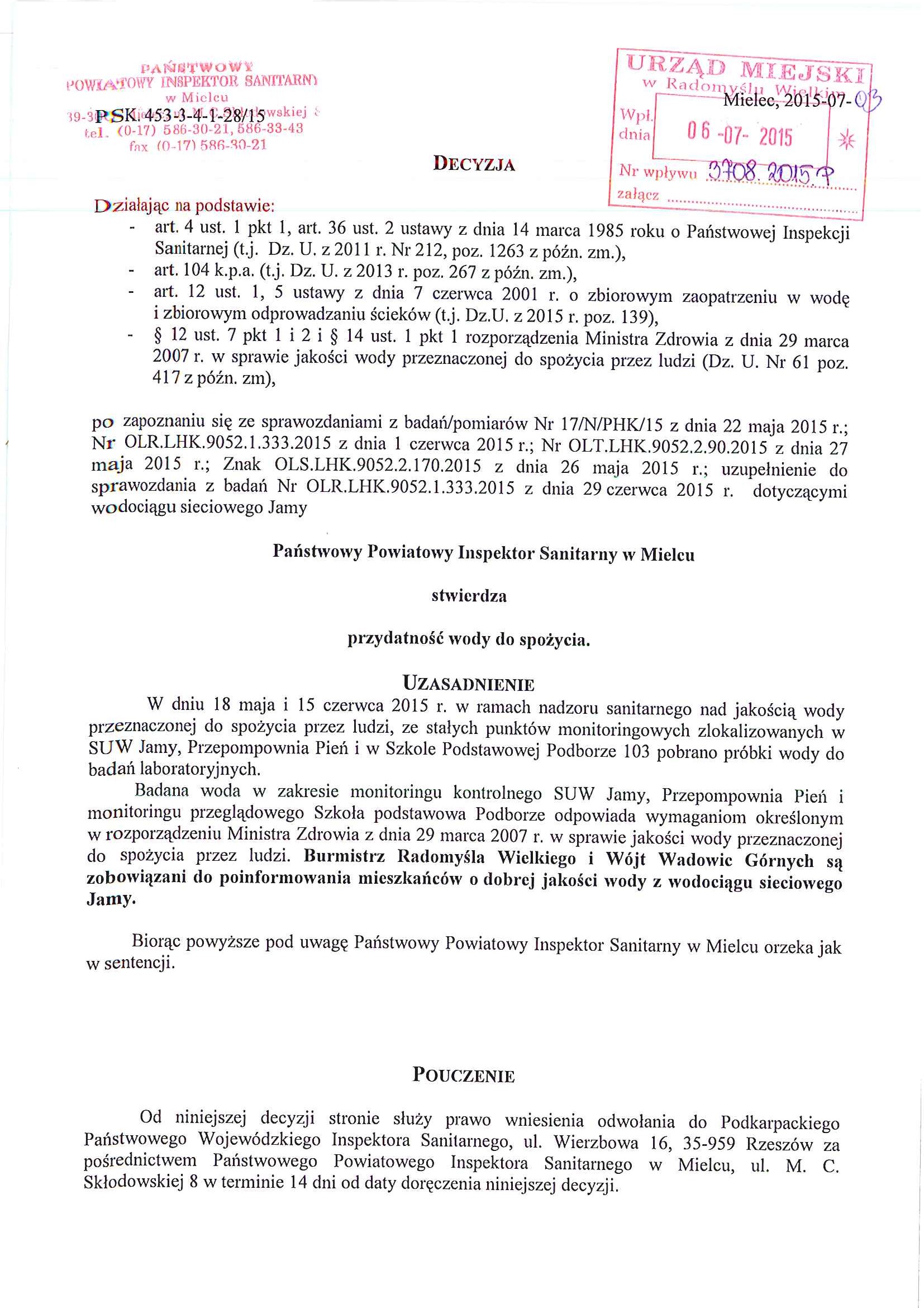 Informacja Burmistrza Radomyśla Wielkiego na temat przydatności wody do spożycia.