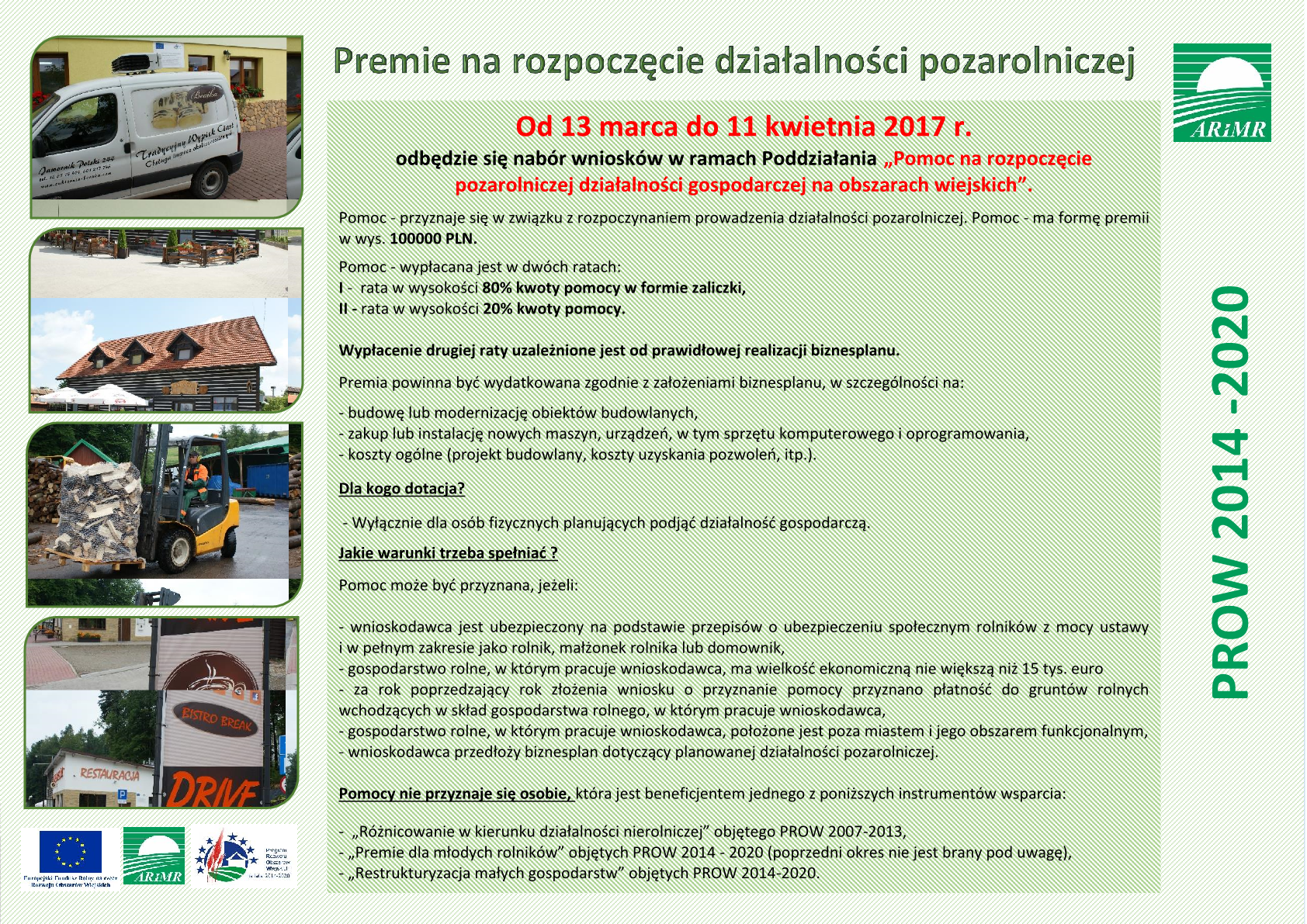 Jest to działanie, dzięki któremu będzie możliwość uzyskania 100 000 PLN na swoją działalność. Nabór wniosków rozpocznie się od 13 marca i potrwa do 11 kwietnia 2017 roku. Szczegółowe informacje o zasadach pomocy udzielanej w ramach w.w. działania dostępne są na stronie internetowe ARiMR, Podkarpackim Oddziale Regionalnym i Biurach Powiatowych ARiMR.