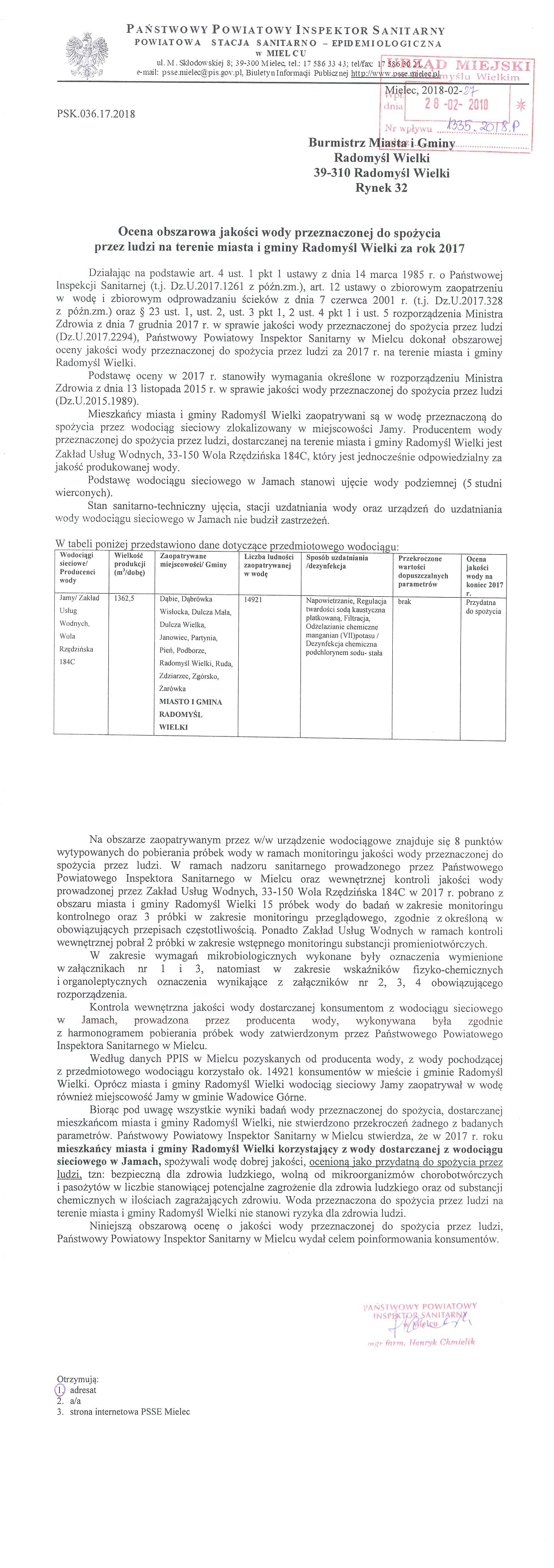 dotycząca oceny obszarowej jakości wody przeznaczonej do spożycia przez ludzi na terenie miasta i gminy Radomyśl Wielki za rok 2017.