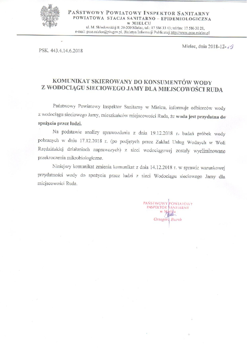 skierowany do konsumentów wody z wodociągu sieciowego Jamy dla miejscowości Ruda