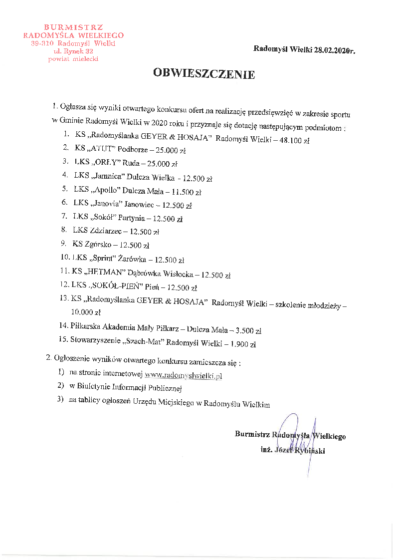 z dnia 28 lutego 2020 roku w sprawie ogłoszenia wyników otwartego konkursu ofert na realizację przedsięwzięć w zakresie sportu w Gminie Radomyśl Wielki w 2020 roku