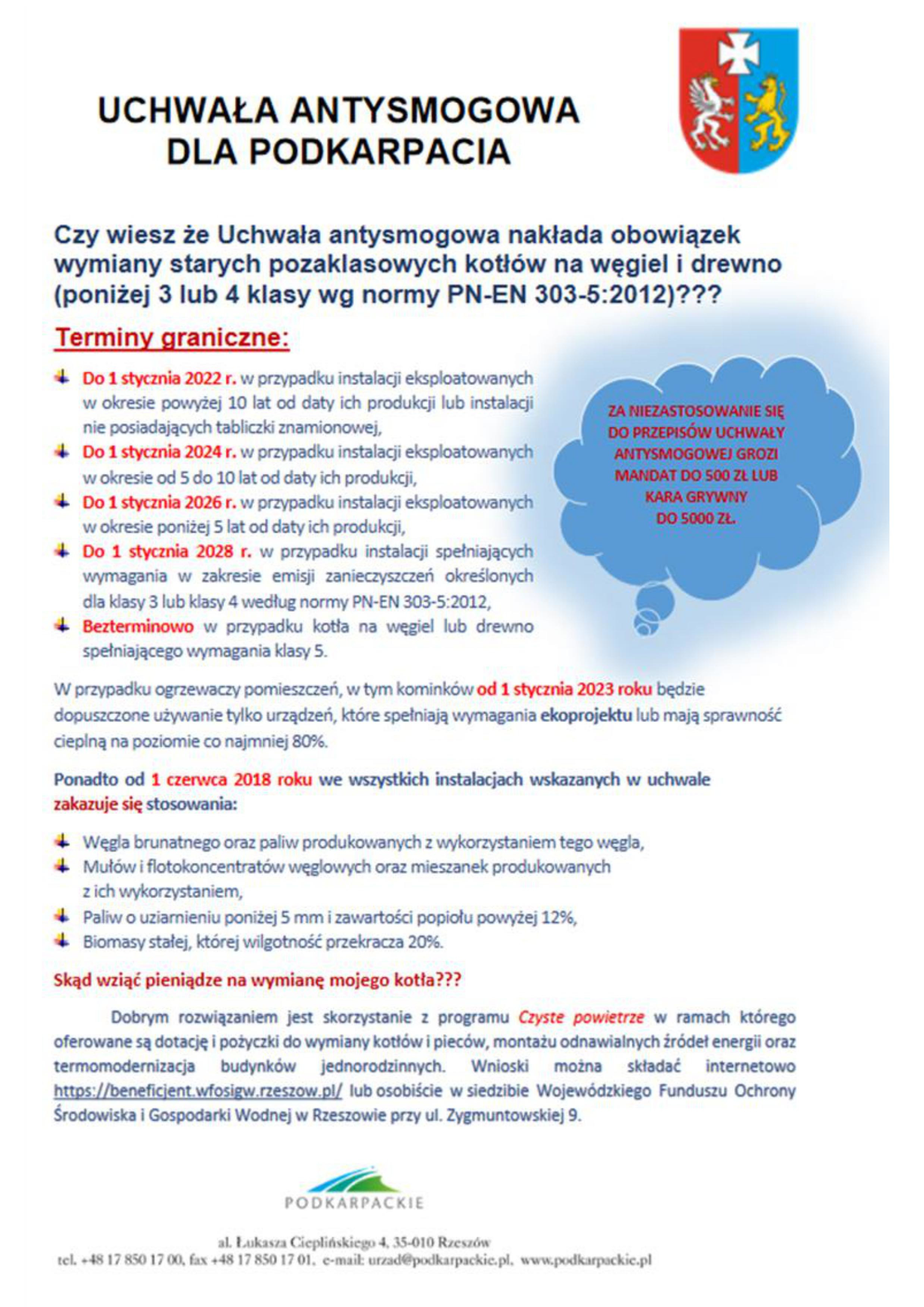 Informacje na temat Uchwały Antysmogowej dla Podkarpacia, do kiedy należy wymienić stary kocioł oraz gdzie szukać dofinansowania.
