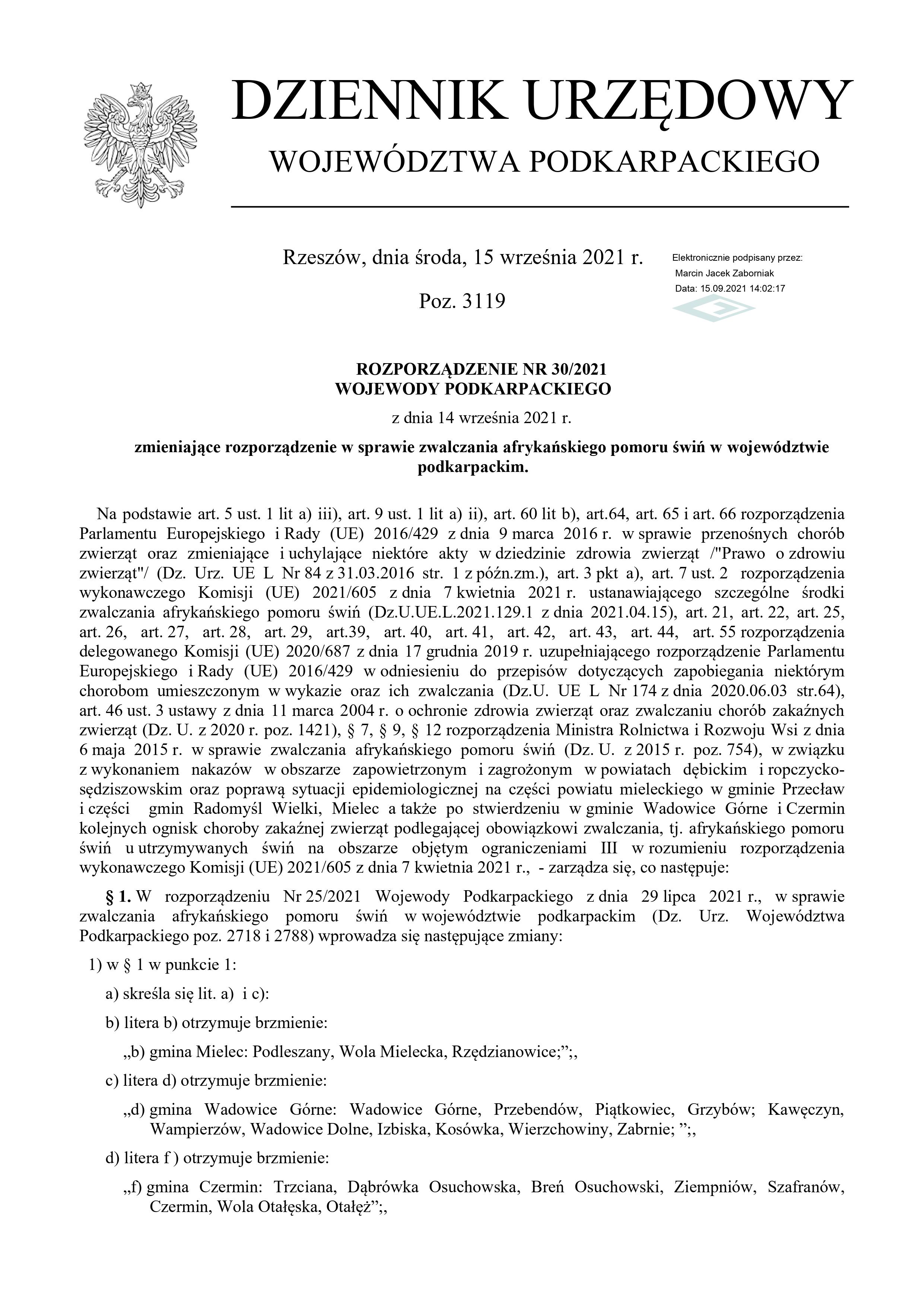 Rozporządzenie nr 30/2021 Wojewody Podkarpackiego