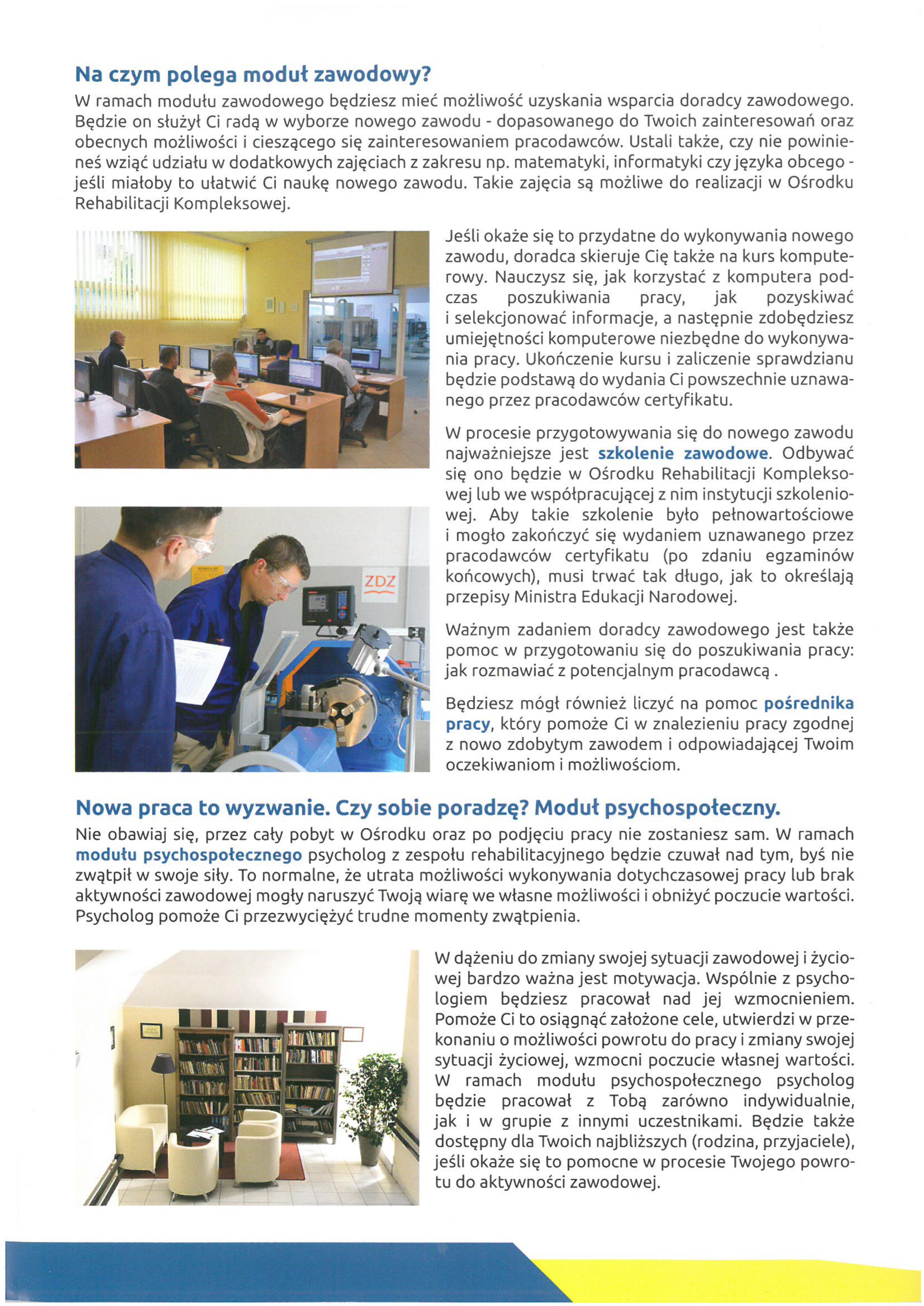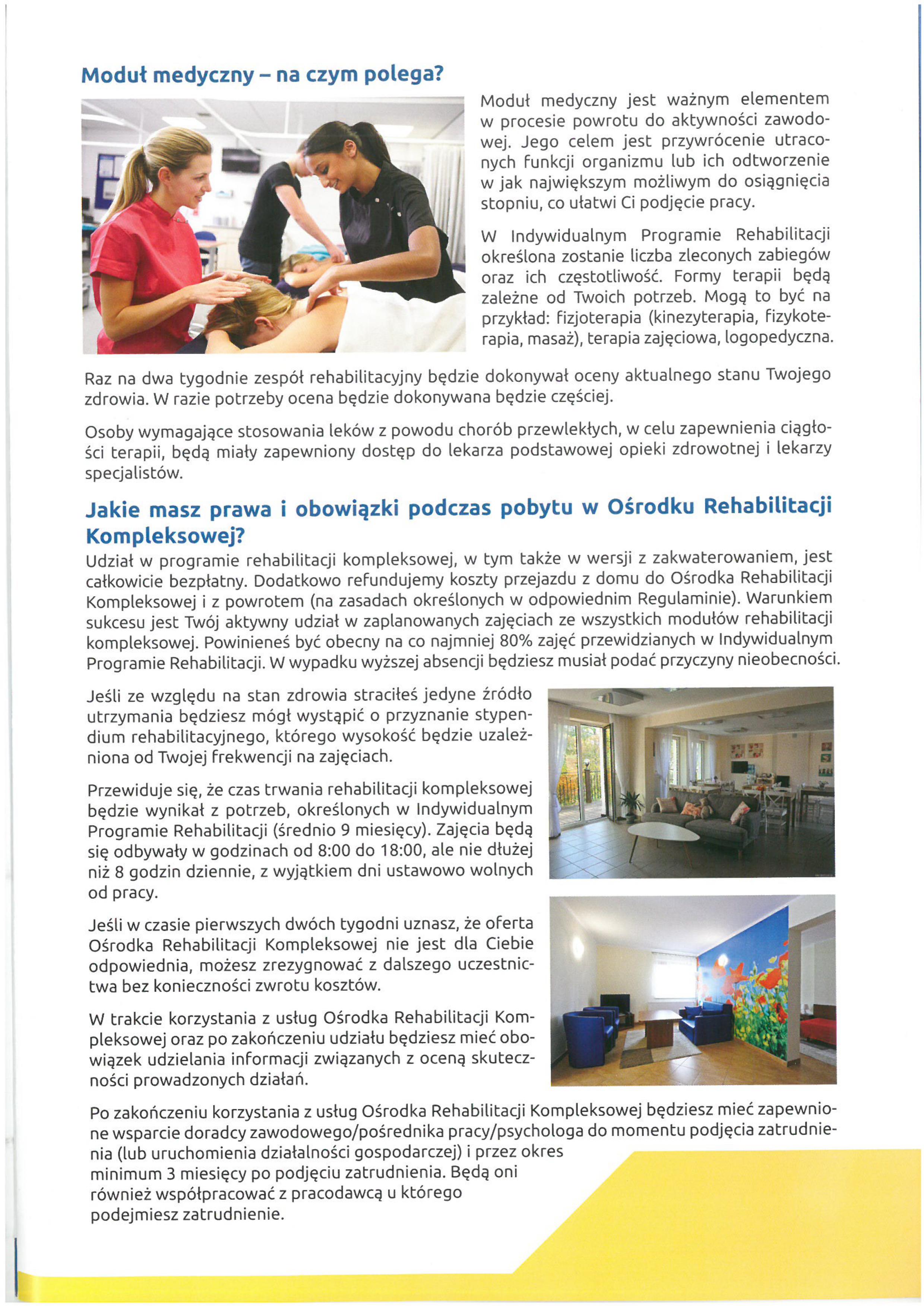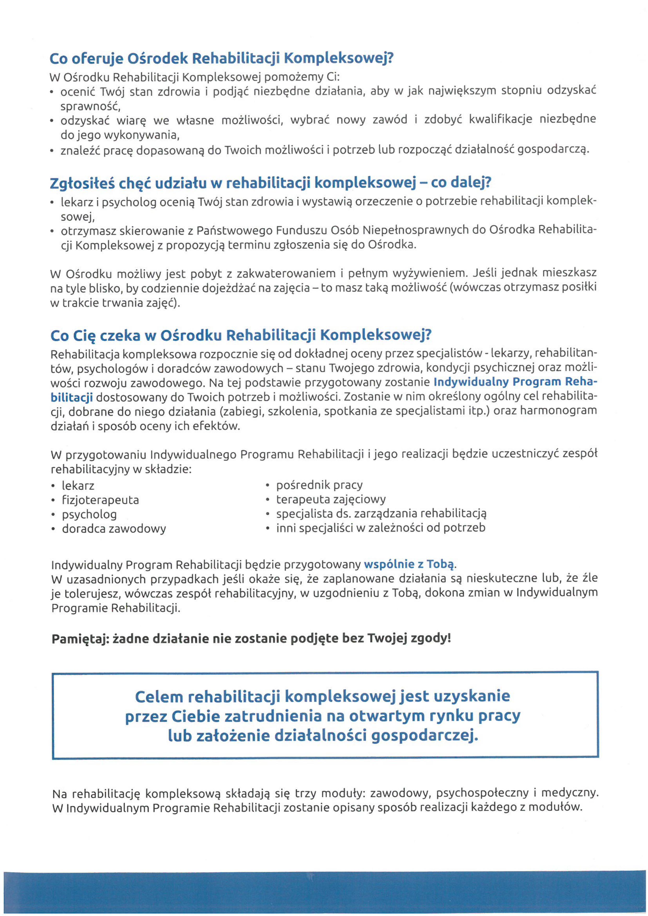 Program rehabilitacji kompleksowej proponuje szereg rozwiązań (pod okiem lekarza, psychologa, doradcy zawodowego, fizjoterapeuty) mających na celu ułatwienie podjęcia pracy lub powrotu do zatrudnienia. Adresowany jest do osób, które wskutek doznanego urazu, zdiagnozowanego schorzenia, niepełnosprawności wrodzonej lub nabytej w okresie rozwojowym, nie mogą kontynuować aktywności zawodowej.