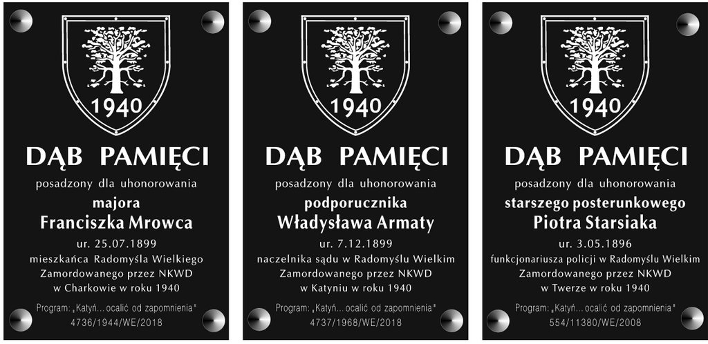 W 2010 r. w 70. rocznicę zbrodni katyńskiej przy Gimnazjum Publicznym im. JP II w Radomyślu Wielkim, zasadzono dęby pamięci poświęcone czterem Katyńczykom związanym z naszą gminą: Upamiętnieni wtedy zostali: