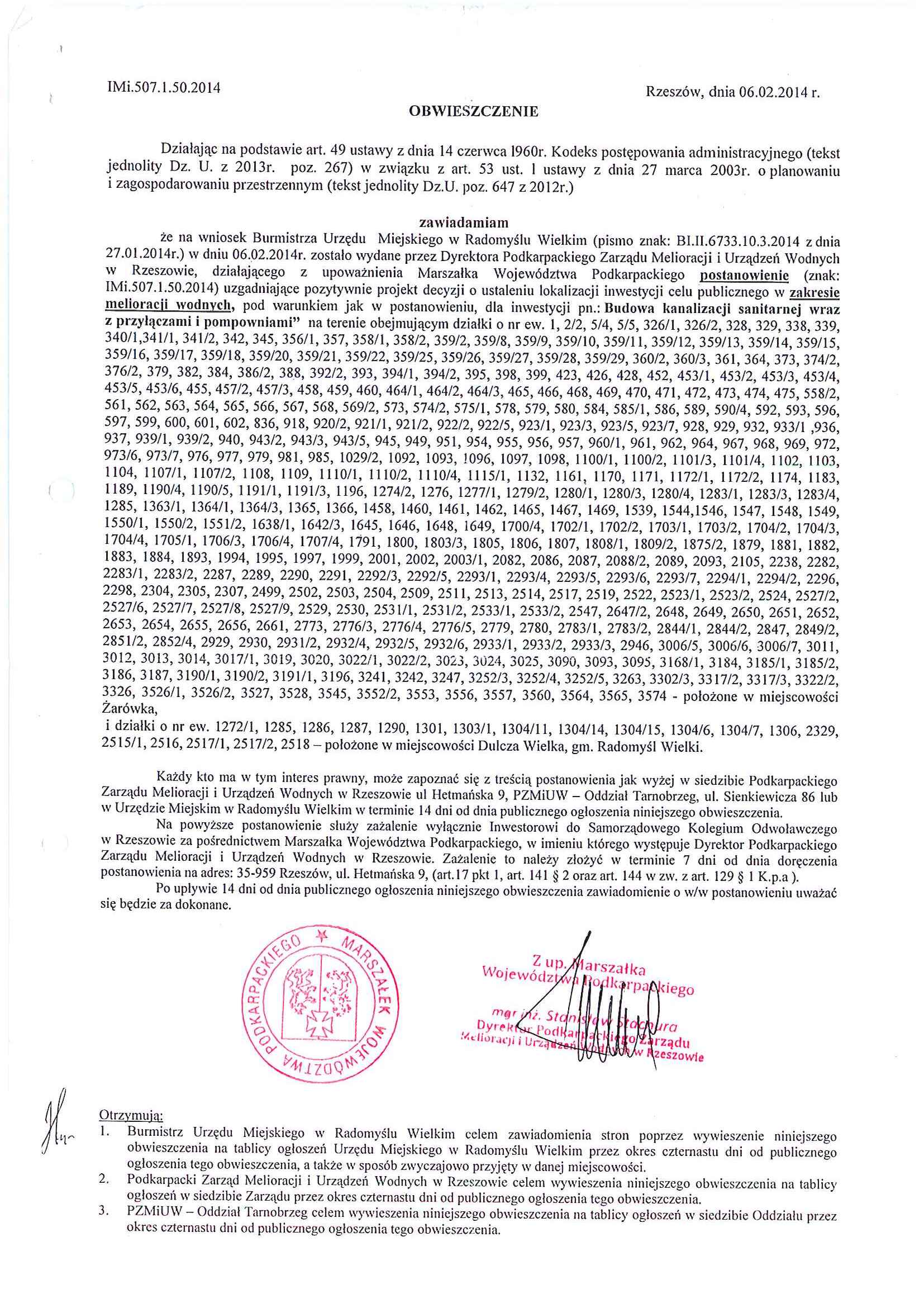 Obwieszczenie Marszałka Województwa Podkarpackiego w sprawie uzgodnienia lokalizacji inwestycji celu publicznego pn: budowa kanlizacji sanitarnej z przyłączami i pompowniami w miejscowości Żarówka.