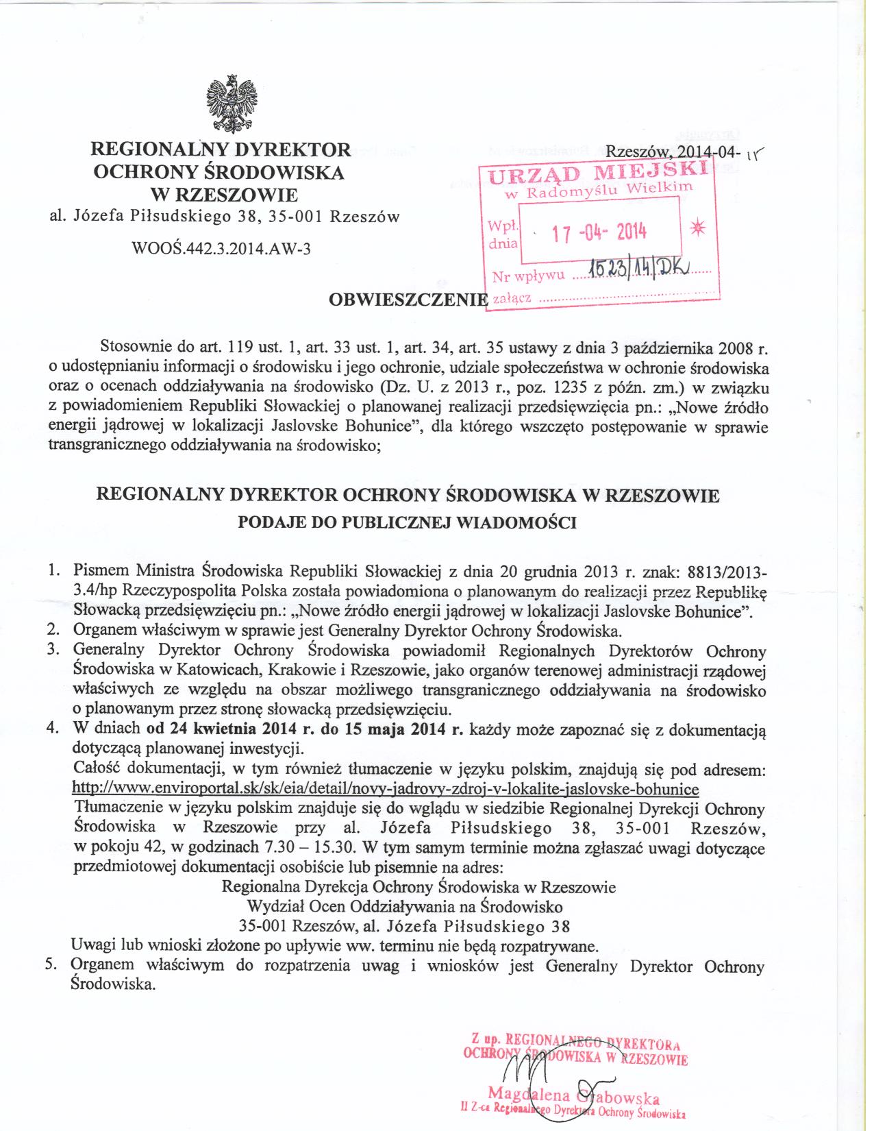 Obwieszczenie Regionalnego Dyrektora Ochrony Środowiska w Rzeszowie