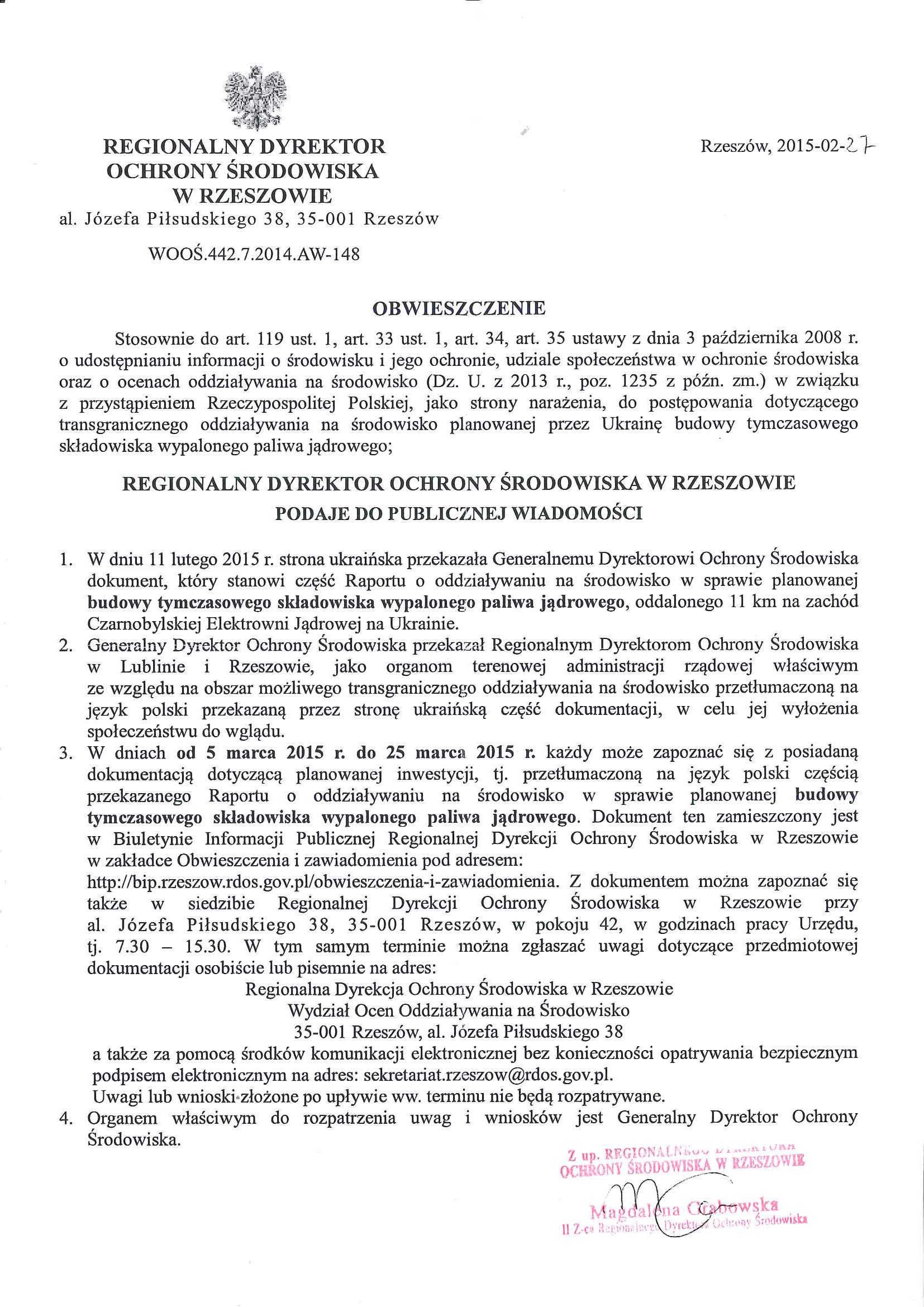 Obwieszczenie Regionalnego Dyrektora Ochrony Środowiska w Rzeszowie