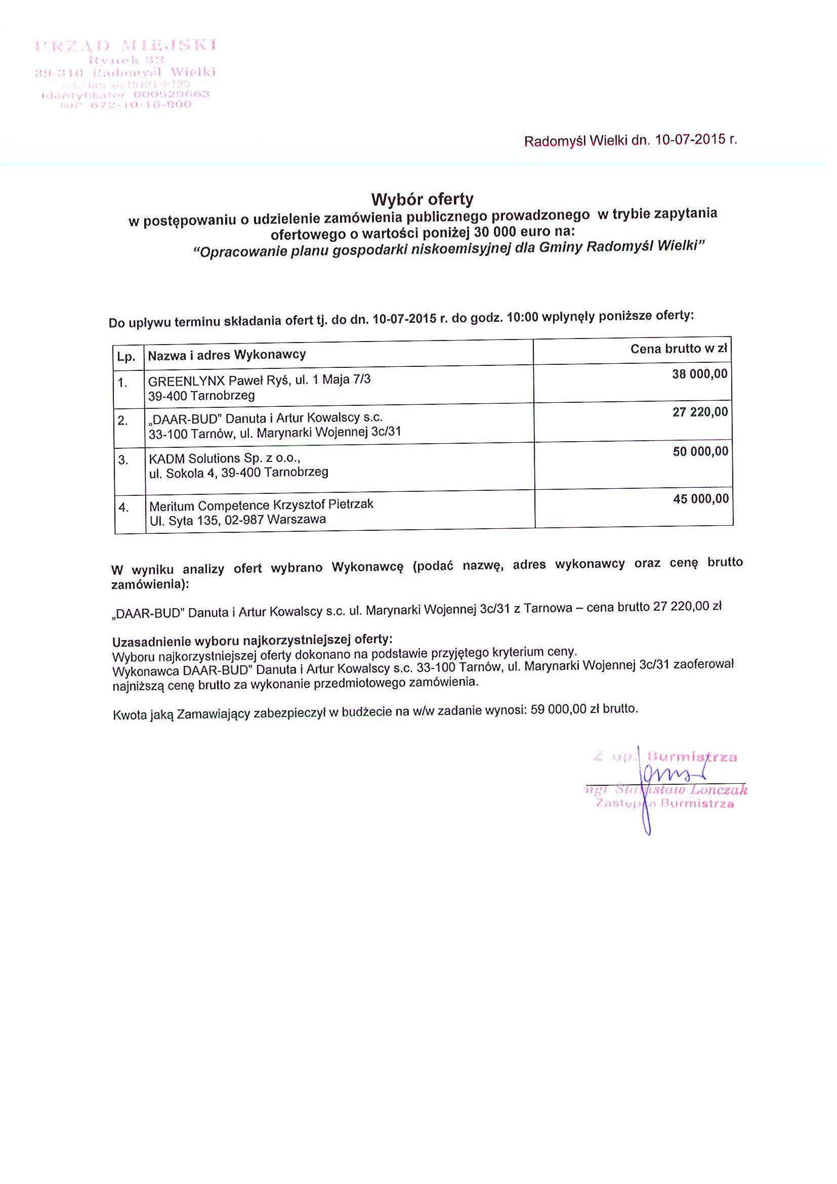 oferty w postępowaniu o udzielenie zamówienia publicznego prowadzonego w trybie zapytania ofertowego o wartości poniżej 30 000 Euro na opracowanie Planu gospodarki niskoemisyjnej dla Gminy Radomyśl Wielki