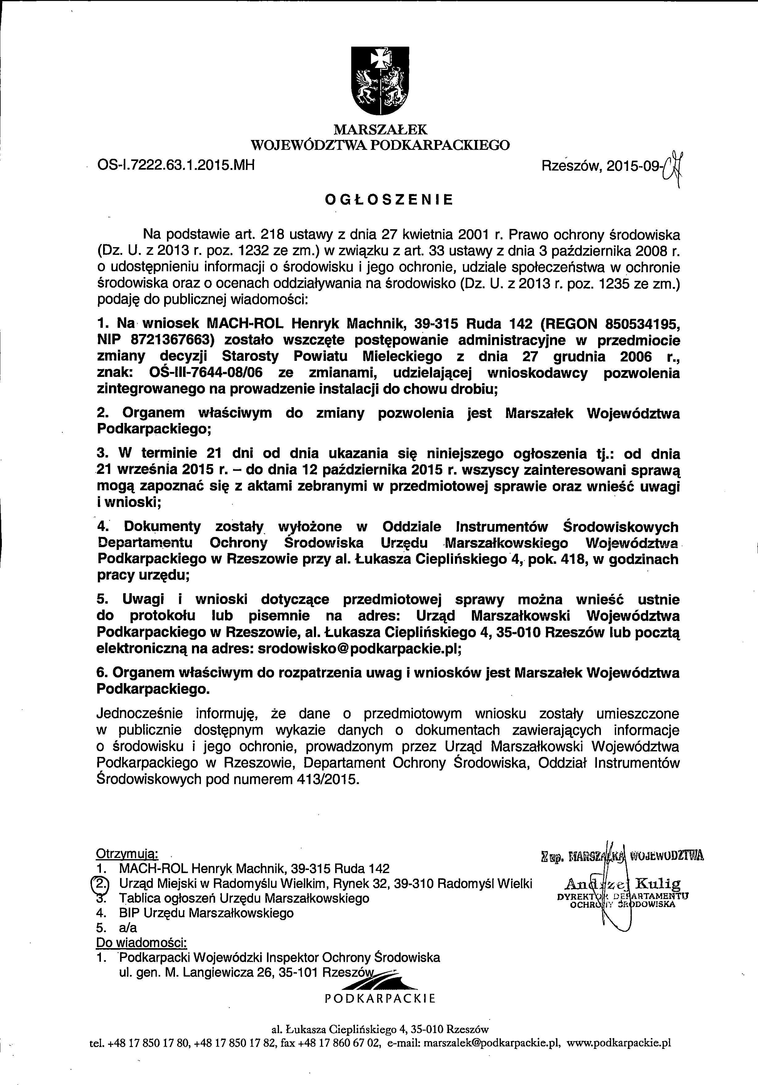 o wszczęciu postępowania administracyjnego w przedmiocie zmiany decyzji Starosty Powiatu Mieleckiego z dnia 27 grudnia 2006 r., znak: OŚ-III-7644-08/06 ze zmianami, udzielającej wnioskodawcy pozwolenia pozwolenia zintegrowanego na prowadzenie instalacji do chowu drobiu