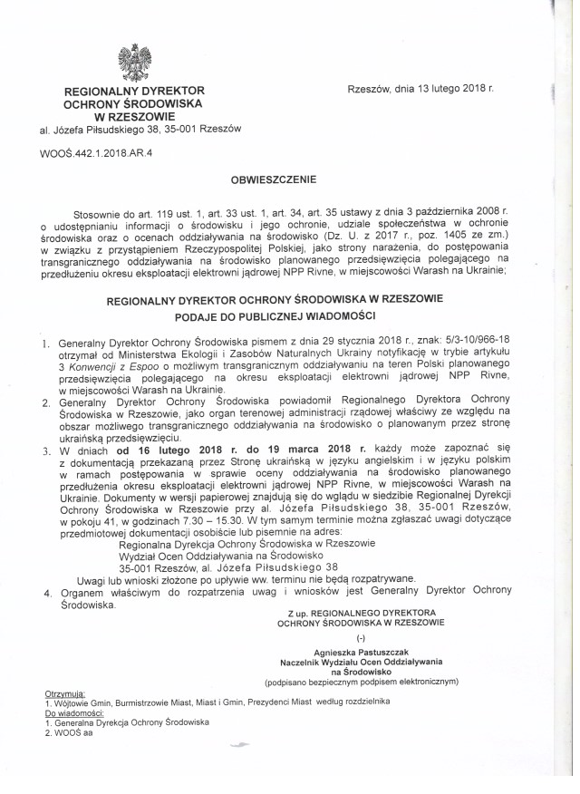 dotyczące postępowania transgranicznego w sprawie oceny oddziaływania na środowisko planowanego przedsięwzięcia polegającego na przedłużeniu okresu eksploatacji elektrowni jądrowej NPP Rivne w miejscowości Warash na Ukrainie.