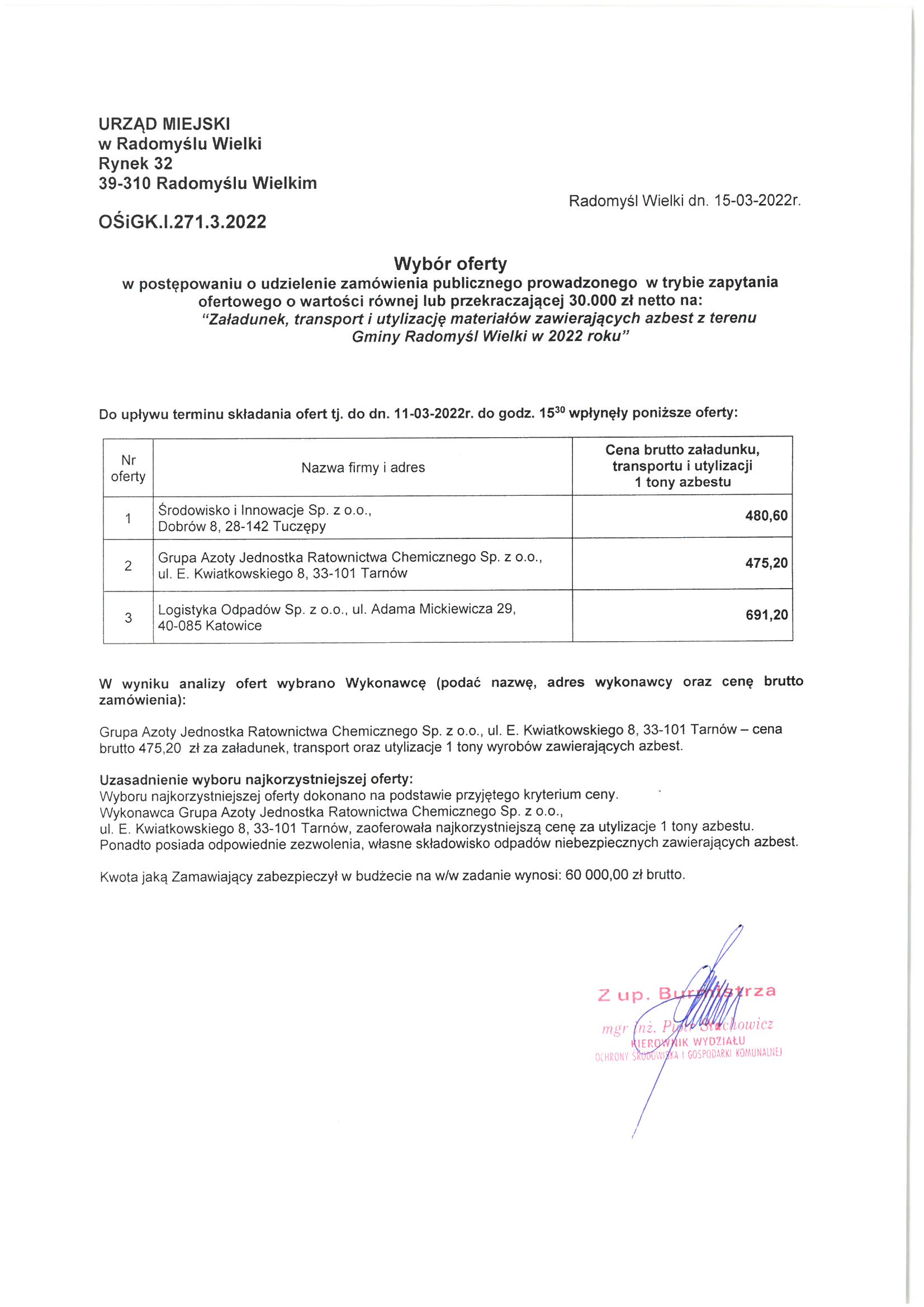 z otwarcia ofert na zadanie pod nazwą: Załadunek, transport i utylizacja materiałów zawierających azbest z terenu Gminy Radomyśl Wielki w 2022 roku.