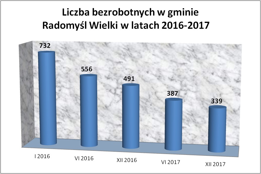 Liczba osób bezrobotnych zarejestrowanych w PUP 30 czerwca 2017 wyniosła 387 (w tym 241 kobiet), z czego 52 osób miało prawo do zasiłku (w tym 35 kobiety), zaś na koniec roku 2017 – 339 osób (w tym 212 kobiet), z czego 48 osób miało prawo do zasiłku (w tym 30 kobiet).