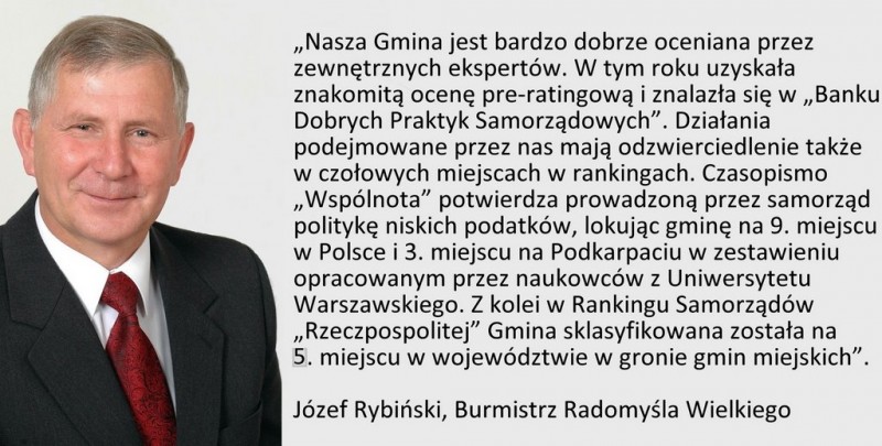 Gmina Radomyśl Wielki znajduje się również w czołówce najważniejszych rankingów samorządowych. W XIII i XIV Rankingu Samorządów opracowanym przez dziennik „Rzeczpospolita” Radomyśl Wielki sklasyfikowany został odpowiednio na trzecim i piątym miejscu w województwie oraz 24. i 55. w kraju na blisko 600 gmin miejskich i miejsko-wiejskich. - Te wyniki świadczą o dobrym zarządzaniu gminą Radomyśl Wielki. Jest to dla nas sukces i docenienie działań naszego samorządu – komentuje zastępca burmistrza Radomyśla Wielkiego Stanisław Lonczak. - Zostaliśmy poddani ocenie tak pod względem finansowym, jak i działań jakie podejmujemy, m.in. oceniane było zapewnienie edukacji przedszkolnej, działalność świetlic dla dzieci, tworzenie placów zabaw, obiektów sportowych, działania podejmowane z zakresu rozwoju przedsiębiorczości czy odnawialnych źródeł energii i wiele innych – dodaje.
