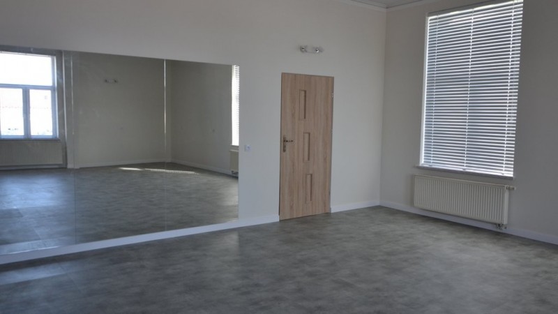 Zakres prac obejmował: demontaż opraw oświetleniowych, włączników i gniazd elektrycznych, boazerii ściennej, drzwi z ościeżnicą pomiędzy salą i korytarzem, drzwi zewnętrznych oraz parapetów. W ramach robót uzupełniono tynki, zamontowano drzwi wewnętrzne z ościeżnicą, drzwi aluminiowe zewnętrzne ciepłe z naświetlem, nowe parapety. Ściany zyskały nową gładź gipsową, zostały zagruntowane i pomalowane, a do wysokości 150 cm polakierowane lakierem wodnym. Wypoziomowano posadzkę i położono na niej odpowiednie pod obecną funkcję panele winylowe. Zamontowano również nowoczesne lampy ledowe energooszczędne, lustra na potrzeby zajęć z fitnessu, a także żaluzje aluminiowe poziome.