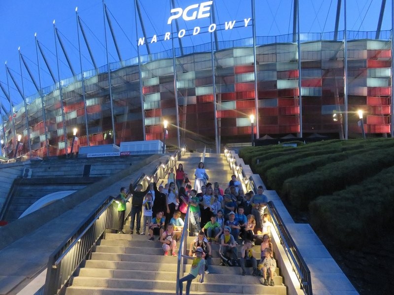 Gdy zmęczenie daje się trochę we znaki przychodzi właśnie pora obiadokolacji. Po niej wielka atrakcja – Stadion Narodowy. Buzie same się otwierają ze zdziwienia że to taki kolos! Nieźle trzeba było się natrudzić by wejść na punkt widokowy. A tu na wysokości odpowiadającej prawie wysokości Pałacu Kultury każdy czuje się bohaterem. Przecież wszyscy poradziliśmy sobie z lękiem wysokości!