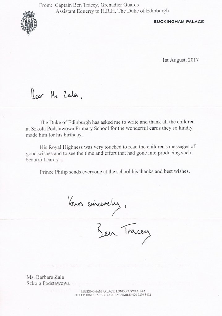 - W połowie sierpnia otrzymaliśmy list z Pałacu Buckingham. Książę Filip poprzez swojego sekretarza serdecznie pozdrowił uczniów oraz podziękował wszystkim dzieciom za ich trud włożony w wykonanie pięknych kartek. Jest nam bardzo miło, że spośród wielu życzeń otrzymywanych z okazji 96. urodzin księcia, nasze kartki zostały zauważone i wyróżnione królewską odpowiedzią – przekazuje Barbara Żala. - Odpowiedź z Pałacu Buckingham umocniła dzieci w przekonaniu, że warto uczyć się języka angielskiego, a list stał się dla uczniów motywacją do dalszej nauki – przekonuje nauczycielka.