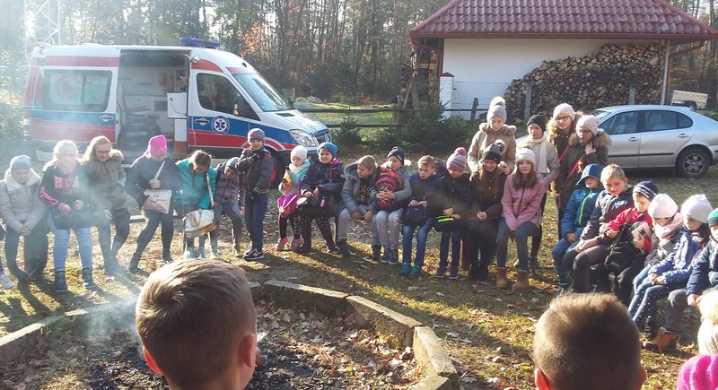 Uczniowie zostali zaproszeni do domku myśliwskiego Koła Łowieckiego „Diana” za sprawą myśliwego Mieczysława Struzika. Na miejscu zadbał o wszystkich Maciej Rachwał, który zorganizował bardzo ciekawe zajęcia. Wszystkie dzieci bardzo chętnie i z wielką ciekawością brały w nich udział. Uczestniczyły w „Pierwszej Pomocy Przedmedycznej”, „Apiterapii” oraz zajęciach z programu „Ożywić Pola”.