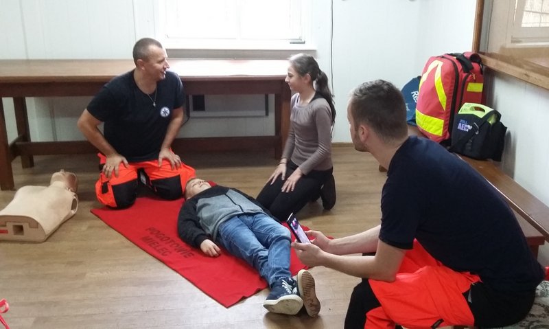 Dzięki uprzejmości dyrekcji Powiatowej Stacji Pogotowia Ratunkowego uczniowie odbyli szkolenie pierwszej pomocy przedmedycznej z udziałem karetki pogotowia. Ratownicy medyczni przeprowadzili bardzo ciekawe i praktyczne ćwiczenia prawidłowego wezwania służb ratowniczych, postępowania przy omdleniach i zasłabnięciach, oraz bezpiecznej pozycji podczas ataku dużego psa. Nie zabrakło ćwiczeń z nagłego zatrzymania krążenia.