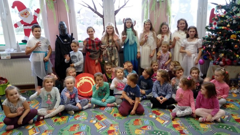 Przygotowali pomysłowe, antyczne stroje i odpowiednie atrybuty. Pracowali też wytrwale nad autoprezentacją, czyli zwięzłą informacją o danym bogu. W ten oto sposób szkolnymi korytarzami kroczyli; Zeus, Hades, Atena, Afrodyta, Demeter, Kora, Amfitryta i Hebe. Ten barwny, starożytny korowód odwiedził dzieci w przedszkolu. Wizyta niecodziennych gości wzbudziła sensację i zaciekawienie. Bogowie i boginie pięknie się zaprezentowali i (jak to bogowie) szczodrze obdarowali słodkościami przemiłych przedszkolaków.