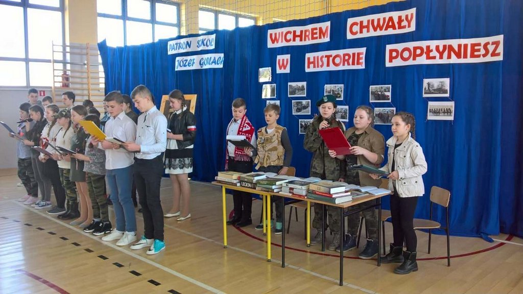 Młodzi artyści przebrali się w stroje własnego pomysłu, inspirując się mundurami partyzantów i powstańców. Podniosły, patriotyczny nastrój podkreślała wymowna dekoracja. Dyrektor Ireneusz Wołoszyn podziękował za piękną i nietypową lekcję historii oraz przypomnienie postaci wielkiego patrioty Józefa Gorlacha. Akademię z okazji święta szkoły przygotowali: Jadwiga Kawka, Lidia Kawa i Ireneusz Weryński.